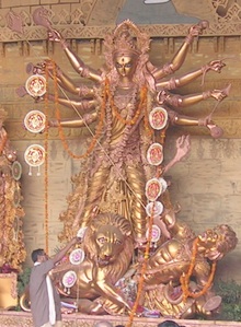 Priest performing navami arati in front of a golden statue of Durga slaying Mahisasur.